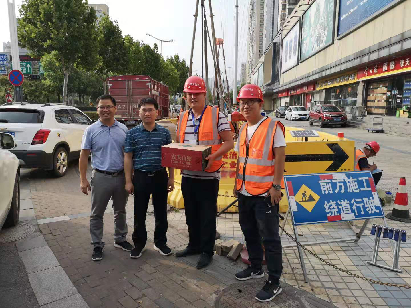 張志鋮、賀錦美一行對南京地鐵九號線勘察項(xiàng)目、南京仙林蘇寧廣場樁基施工勘察項(xiàng)目上的工作人員送上了防暑降溫用品、礦泉水等慰問品,關(guān)切地詢問了一線作業(yè)人員的生產(chǎn)生活情況(見照片8~9)。